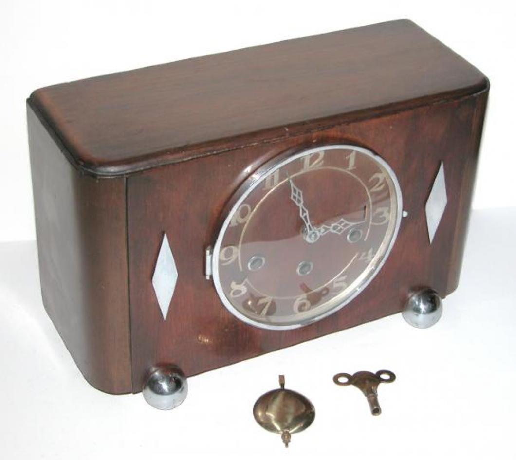 | | A FLEET mantel clock with walnut wood case and chromed ball feet plus applique diamonds. |
